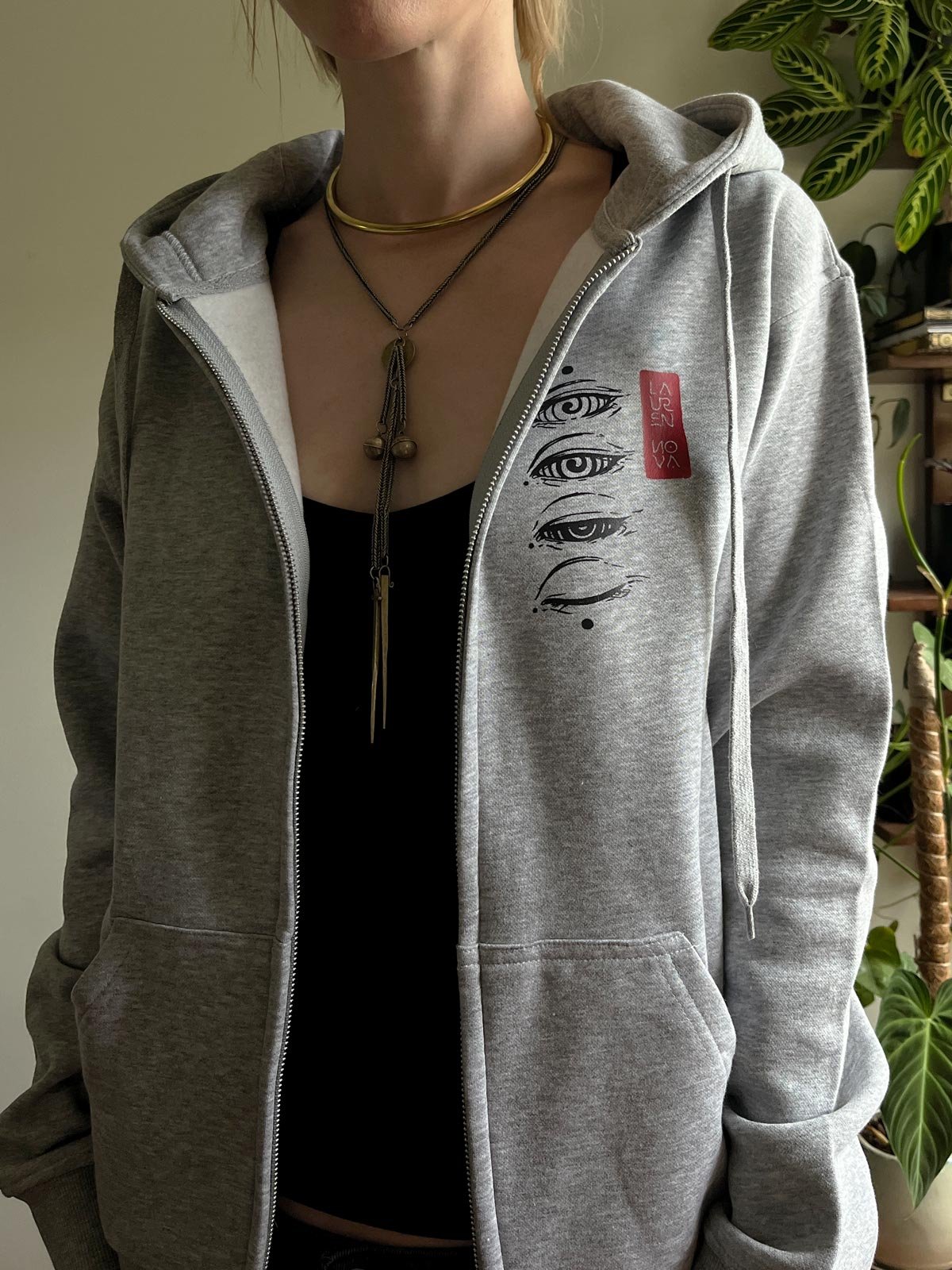 - Unisex zip-up hoodie printed on the front with "Lucid Waker" ink painting by Lauren Nova